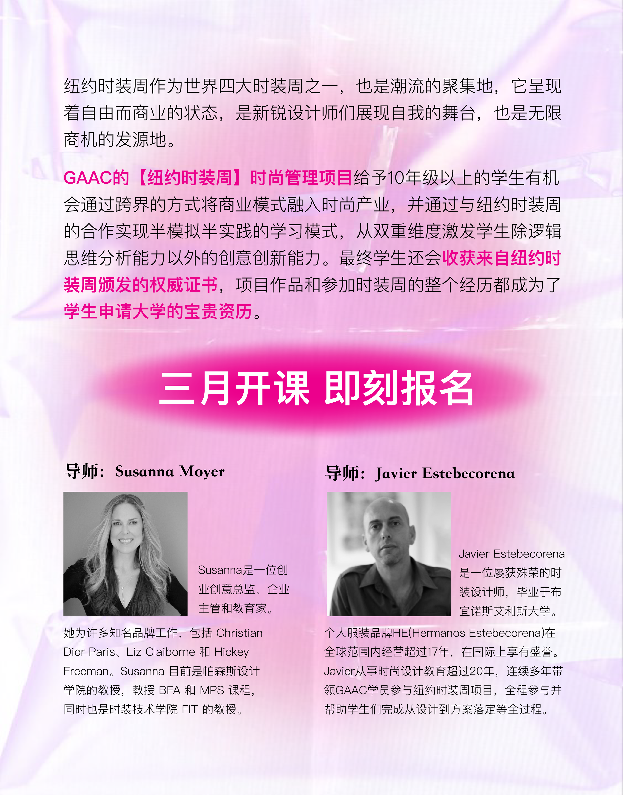 顶配搭配顶流,【纽约时装周】项目带给学生的不仅仅是实现创意梦想的舞台,更是增强履历、收获实践经验、开阔视野的机会。顶配的师资结合国际化工艺展来多元化教学,让学生起步于康庄大道之上。顶流的人脉与资源,将学生置于焦点,更是能更近距离的向共事的前辈同行和业内精英请教。
