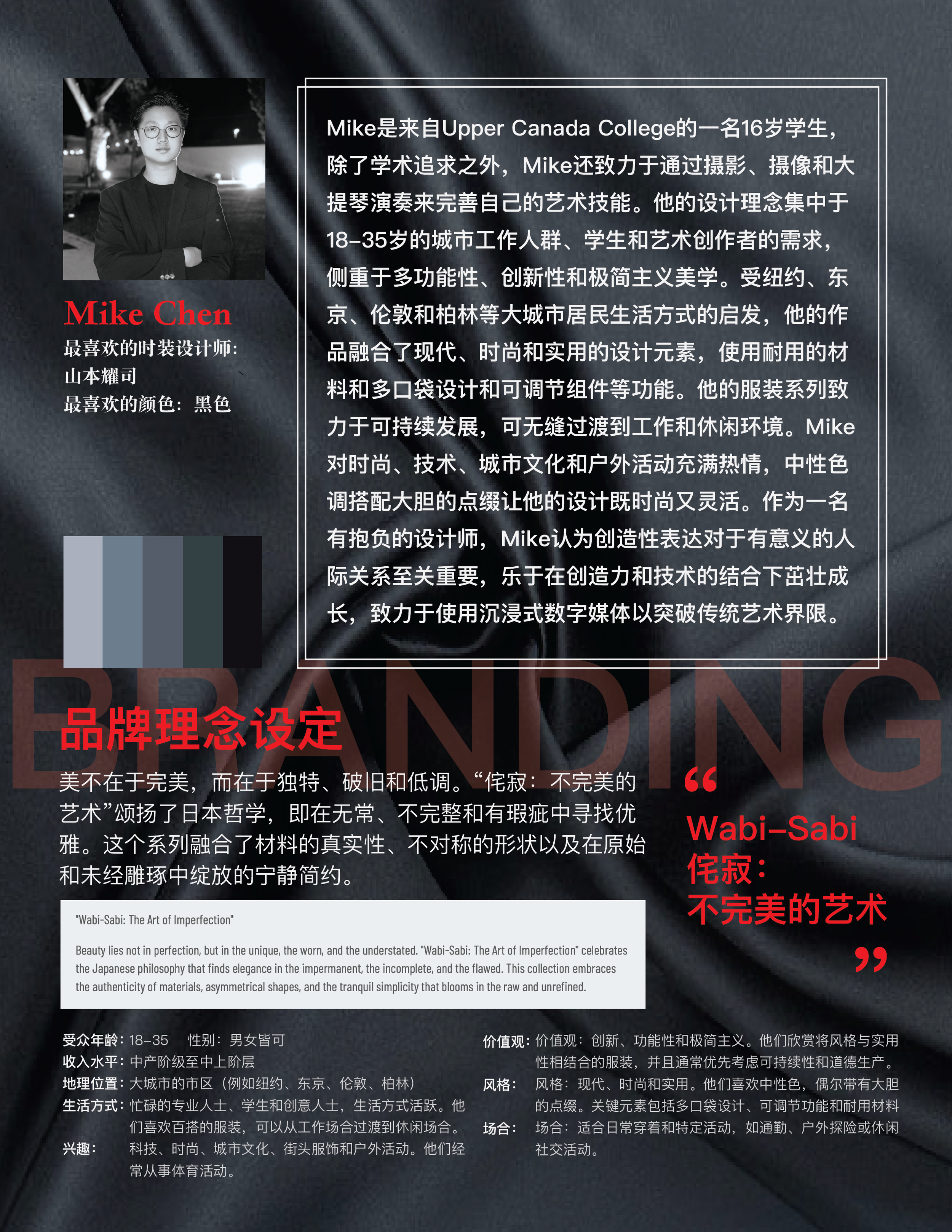 Mike的设计以极简剪裁、自然肌理和低饱和色调为标志,他擅长通过面料的选择与解构手法,塑造出富有故事感的男装。布料上的一丝褶皱、一道手工缝线,皆是对“残缺之美”的致敬。他的作品不仅仅是一套服装,更是一种态度——接受不完美,拥抱真实。