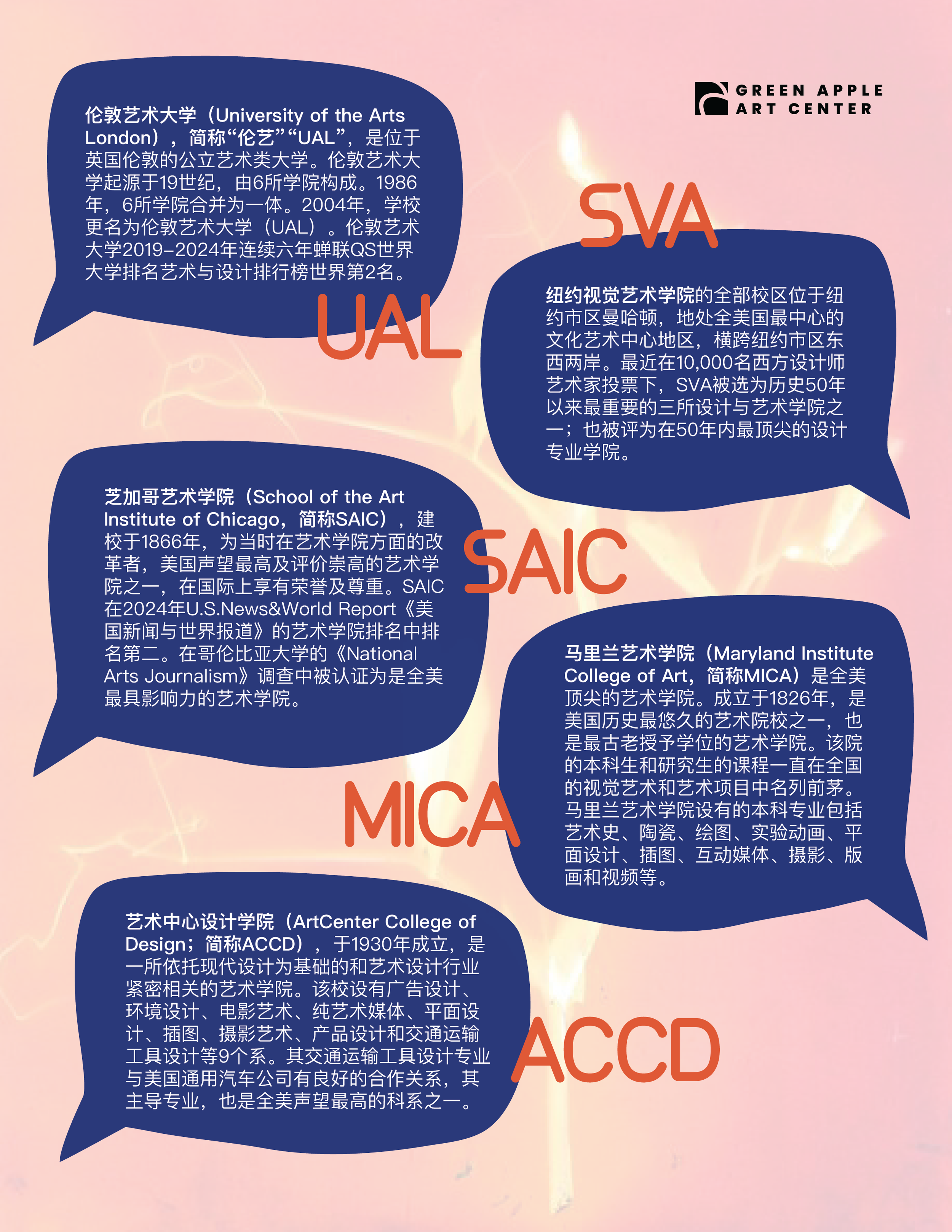 纯艺的考生们也在申请的时候也不要盲目挑选学校哦!了解自己的专业倾向和学校强项将会使你更大几率的被梦校录取。GAAC在这里为大家推荐五所知名纯艺院校,虽算不上顶尖,但各个都非常拿得出手。考虑英国的学生们可以考虑申请UAL,在英国乃至欧洲都能叫得上名号的一所院校。考虑美国的学生们,可以考虑SVA纽约视觉艺术学院、SAIC芝加哥艺术学院、MICA马里兰艺术学院和ACCD艺术中心设计学院,这几所学校将会极大概率的为优秀的学生发放高额奖学金,所以学生们可以不花费太高额的成本前往美国深造啦!