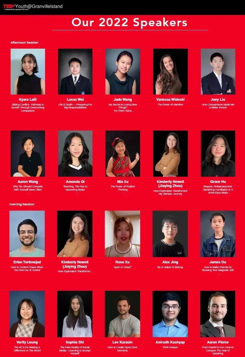本着所在社区的精神,TEDxYouth@GranvilleIsland 通过探索当下与年轻人相关的话题,从有趣和多元化的角度了解到年轻人的思想。我们的活动希望给予年轻人肯定、赋予他们思想的价值,无论是本地还是来自全球的年轻人,我们旨在为社会中年轻群体提供一个平台,让他们向更多的观众分享他们的想法。